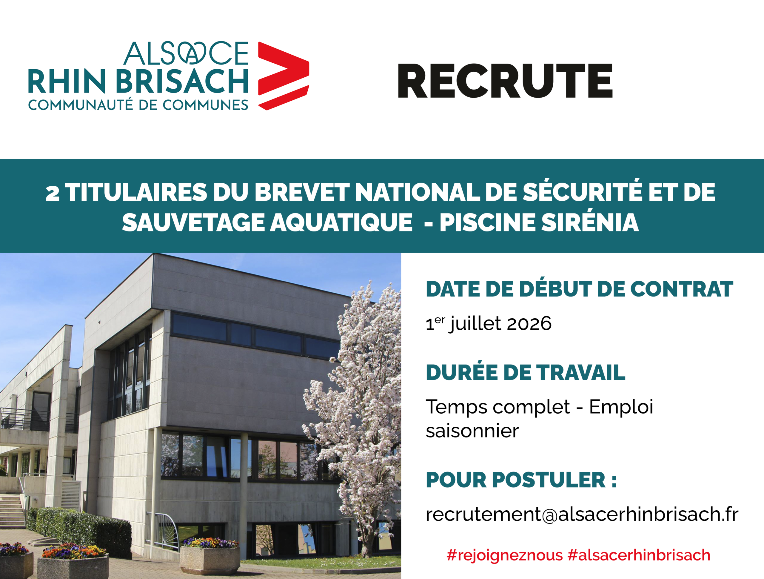 La Communauté de Communes recrute un titulaire du Brevet National de Sécurité et de Sauvetage Aquatique pour la saison estivale 2026 à la piscine Sirénia à Vogelgrun.
