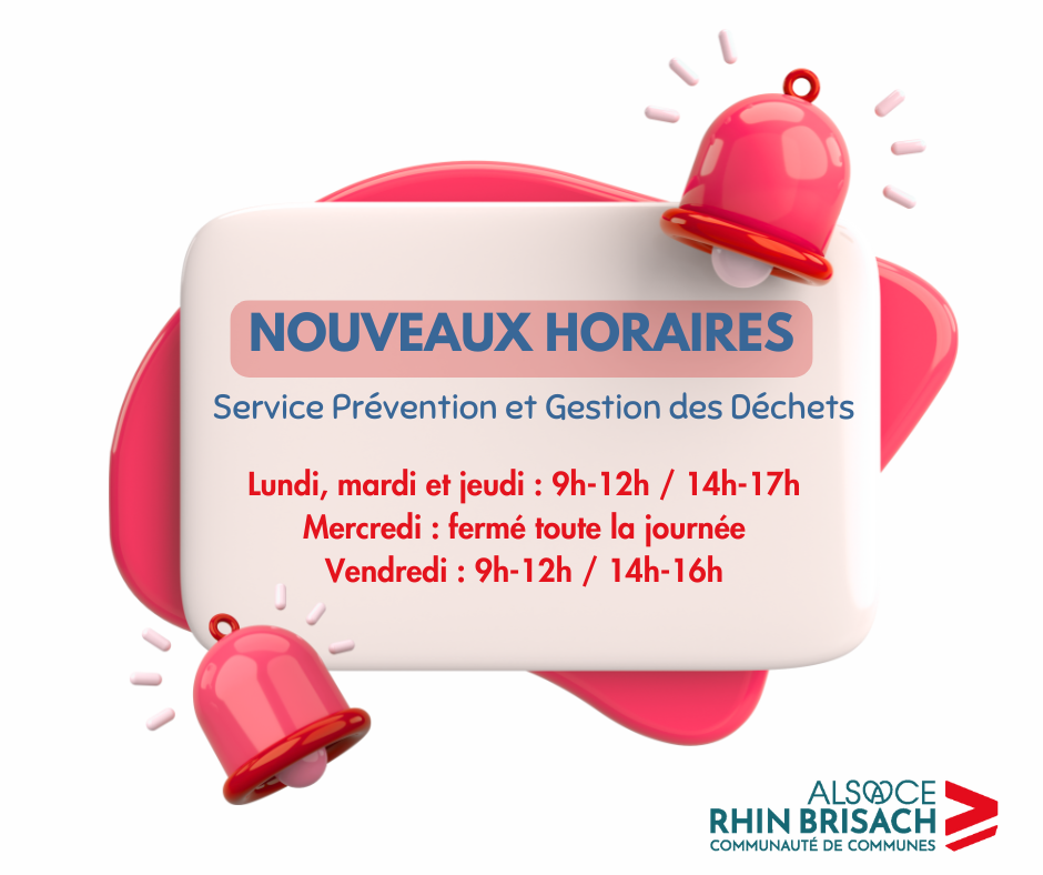 Le service Prévention et Gestion des Déchets vous accueille dans ses bureaux situés au 30 rue de l’écluse à Biesheim (1er bâtiment à droite de l’entrée de la déchèterie) aux nouveaux horaires suivants :